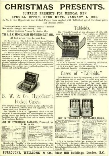 As ever, Burroughs Welcome & Co were at the forefront of marketing, and promoted their products at “special Christmas prices,” or specifically as Christmas presents.